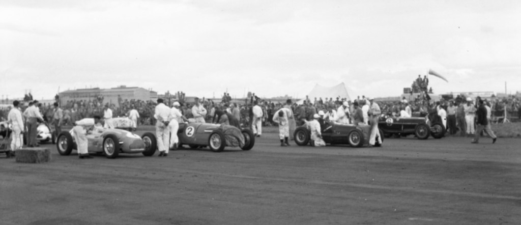 The front row of the Victorian Trophy grid at Fishermans Bend on Sunday, October 4, 1953 comprises, from the left, Doug Whiteford’s Talbot-Lago T26C, Stan Jones’ Maybach 1, Cec Warren, Maserati 4CL and Lex Davison, Alfa Romeo P3.