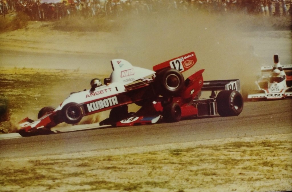 Take No Prisoners. Classic dive and chop manoeuvre between Perkins’ Elfin MR8 and Alfie’s T430 eliminates both at the start of the 1979 AGP at Wanneroo Park. A great pity, as that joust could have been really something (unattributed)AGP victor John Walker is licking his lips in the #25 white Lola T332 behind the Wanneroo Air Show (unattributed)