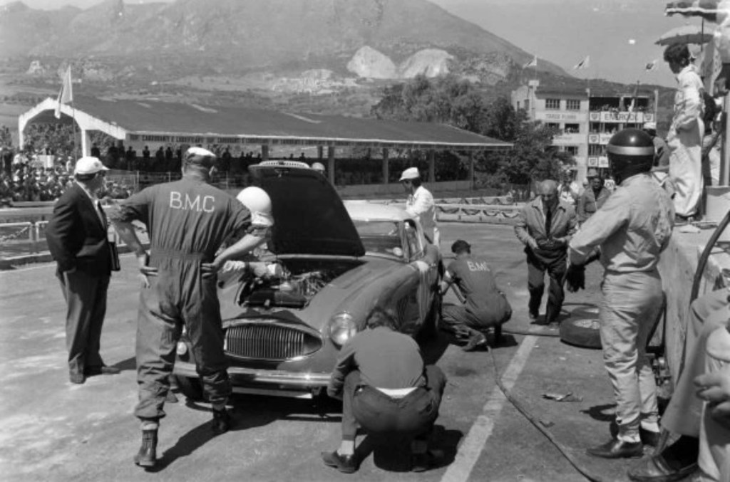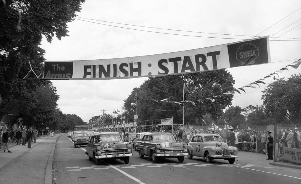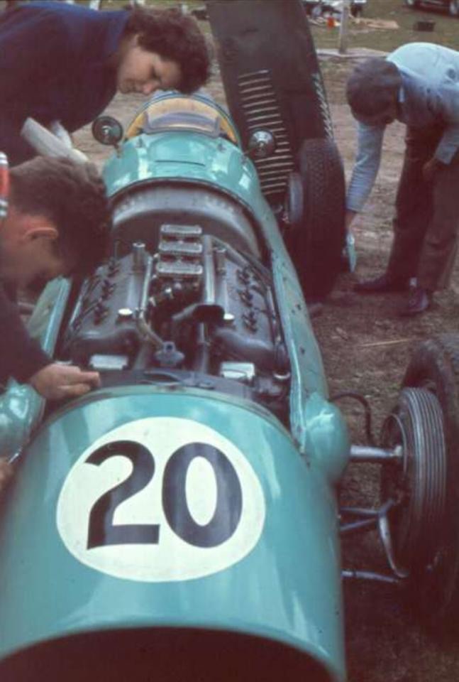 And the shot below shows young Allan Jones with his hand on the Ford watch the start of the 1958 Melbourne Grand Prix won by #7 Stirling Moss’ Cooper T45 FPF from Jack Brabham’s similar car #8.