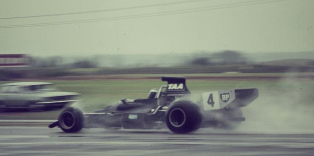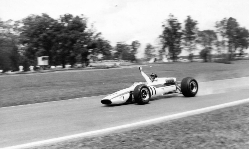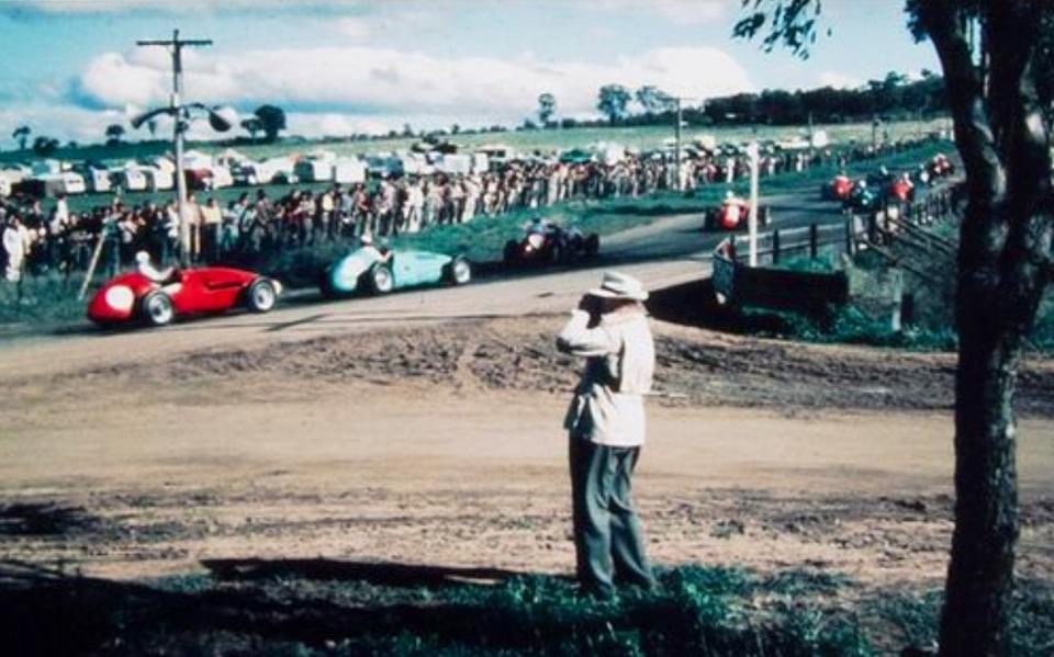 Three-wheel angel ride into Creek Corner for Leo at Warwick Farm, date unknown, but the 39 is still in its Climax FPF days. It wasn’t the only time the knock-offs ‘misbehaved’, he had a similar adventure at Longford during the 1968 meeting.