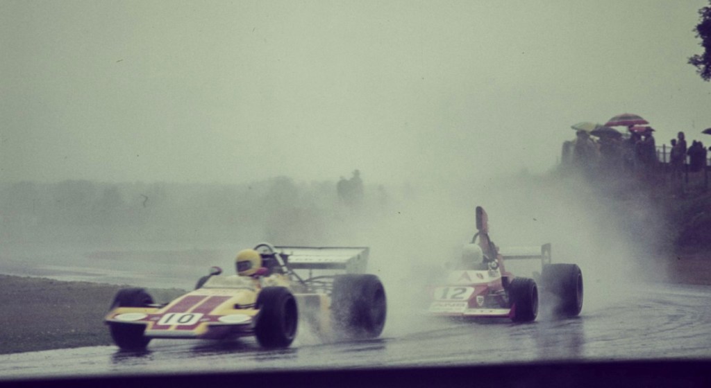 Max Stewart on the way to winning the April 2, 1972 Singapore Grand Prix on the Thomson Road circuit, Mildren Lotus-Ford 1.6 from Vern Schuppan’s March 722 and Bob Muir’s Rennmax BN3, both cars also Lotus-Ford powered.