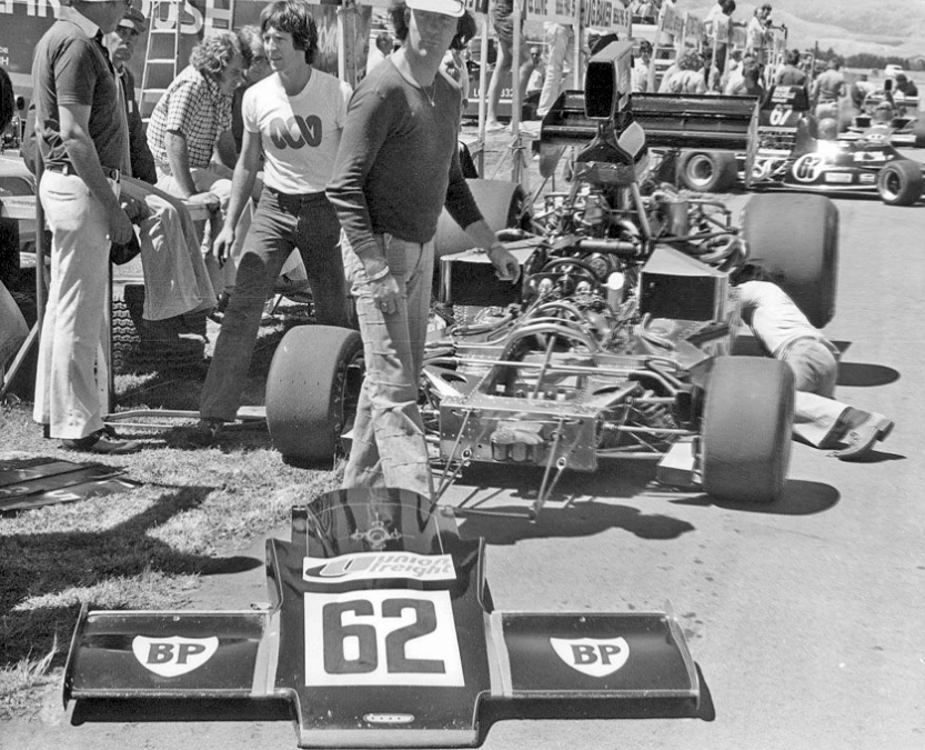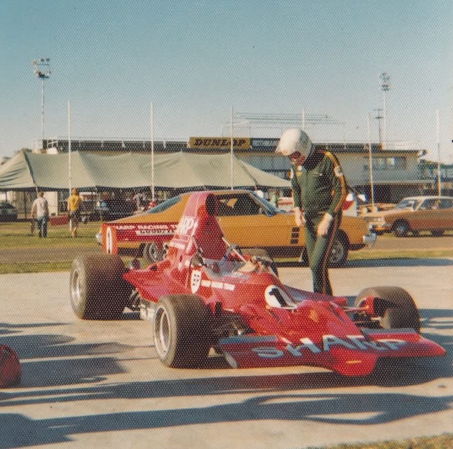 #3 is Phil West’s Scuderia Veloce Brabham BT23A Repco, alongside him is John Walker’s Elfin Mono, the helmet under KB’s wing is Scott’s, I’m not sure about the fella behind Scott with the black helmet.