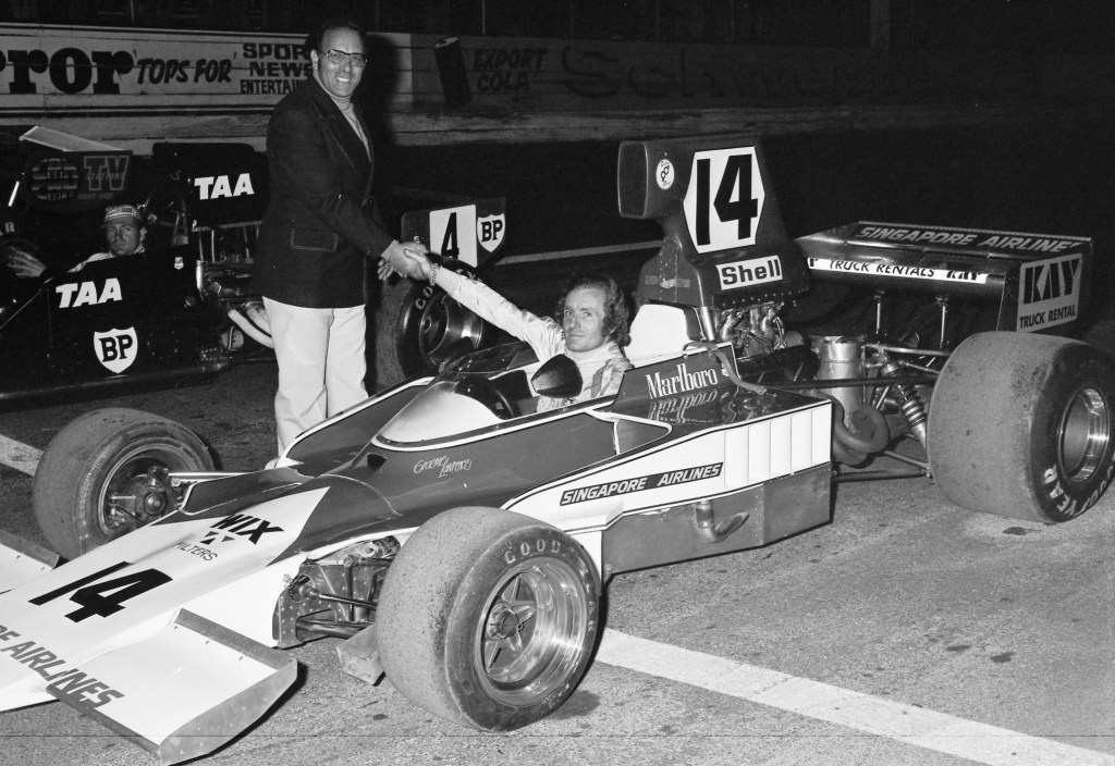 Graeme Lawrence shakes hands with Liverpool Speedway promoter, Frank Oliveri after an F5000 demonstration on the high speed, paved, quarter mile oval circa-1974.