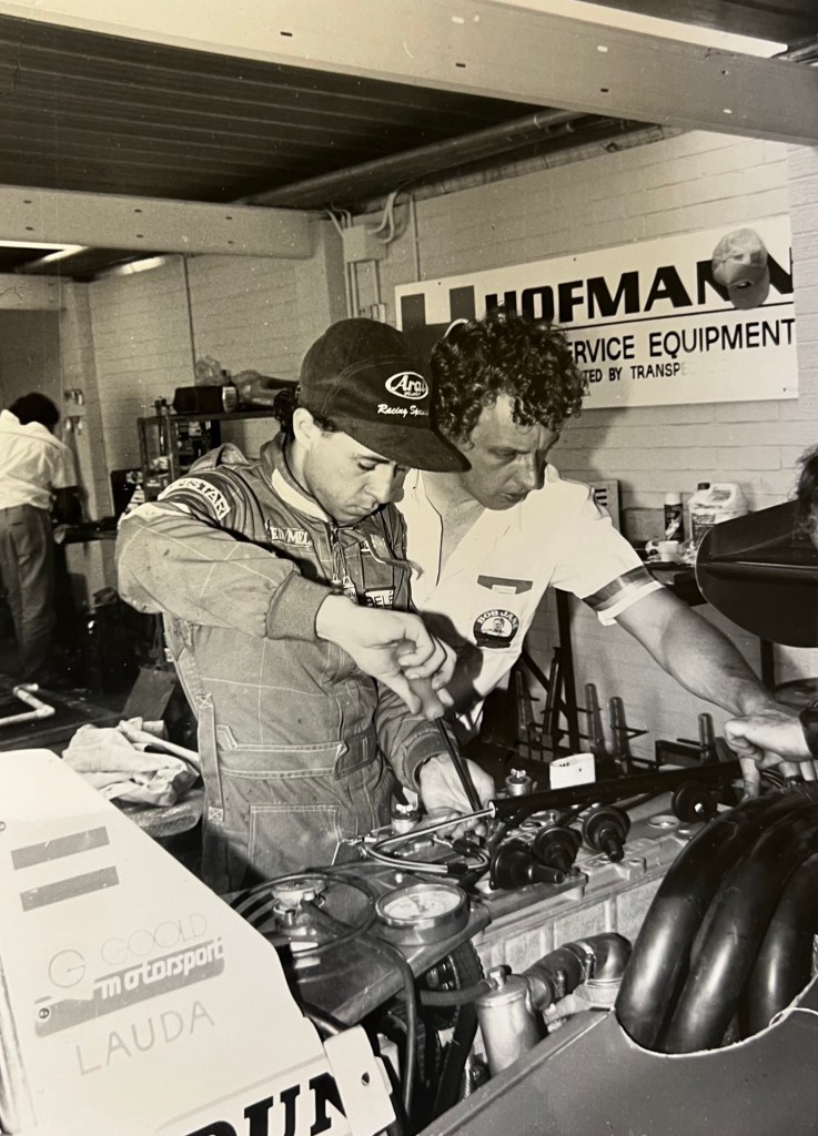 Roberto Moreno giving Harvey Spencer a hand on Niki Lauda’s Goold Motorsport – Greg Siddle – Ralt RT4/85 Ford during practice at Calder over the November 18 weekend. The compression tester is there with diagnostics underway.