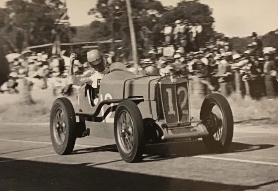 Allan Tomlinson waves to the punters as he takes a sensational victory in the 1939 Australian Grand Prix at fearsome Lobethal aboard his oh-so-carefully prepared and skilfully driven MG TA Spl s/c on January 2. See here for a feature on the race: https://primotipo.com/2020/12/04/tomlinsons-1939-lobethal-australian-grand-prix/