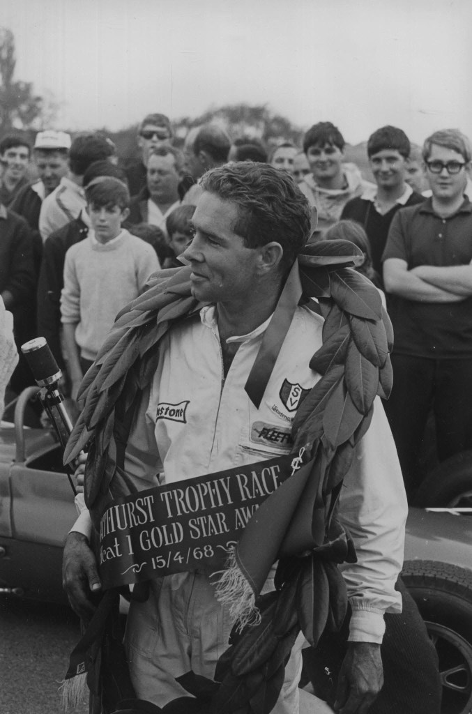 Phil West basks in the admiration of the Mount Panorama crowd after winning the Bathurst round of the Gold Star, Easter 1968.