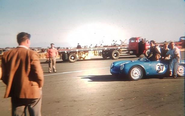 Multiple Australian Hillclimb Champion Bruce Walton gives the Norman Hamilton crew a lift through the Fisherman’s Bend paddock in 1958, Porsche 550 Spyder. See here for a feature on this car; Hamilton’s Porsche 550 Spyder… | primotipo…