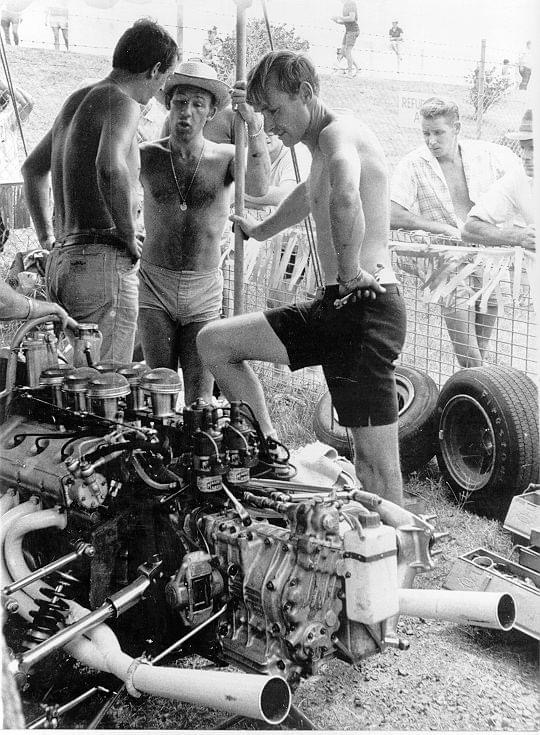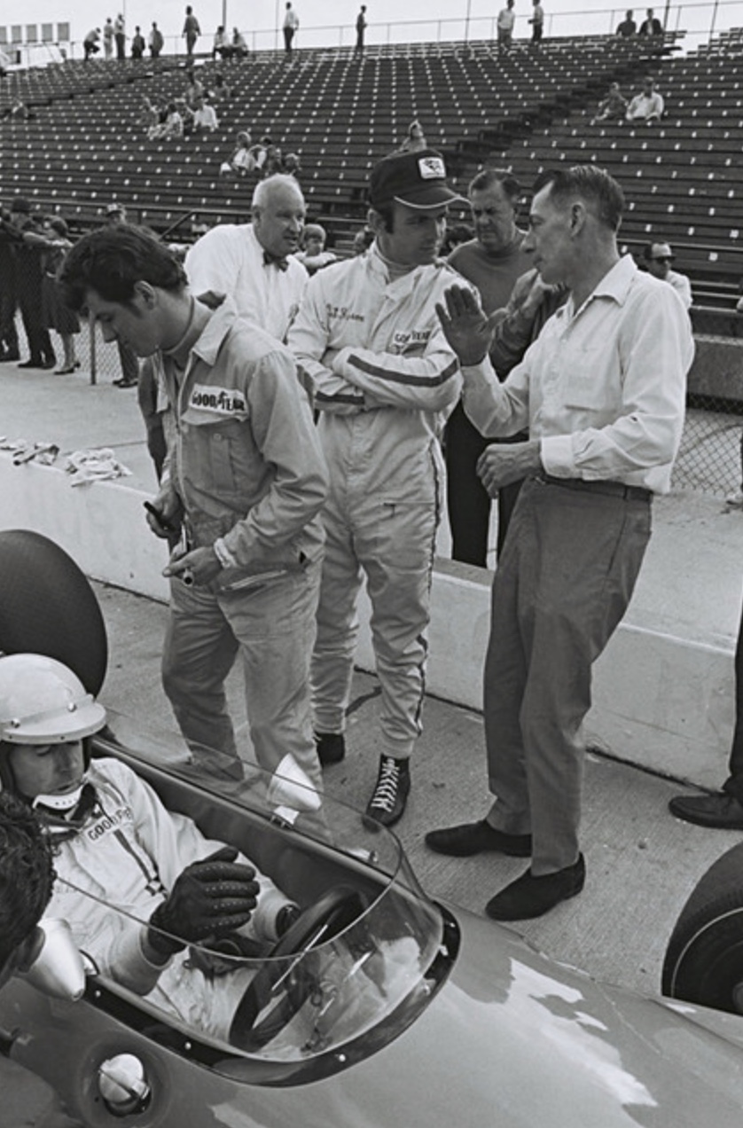 Jack Brabham, Peter Revson and Ron Tauranac at Indianapolis in 1969.