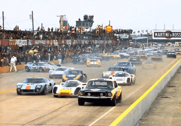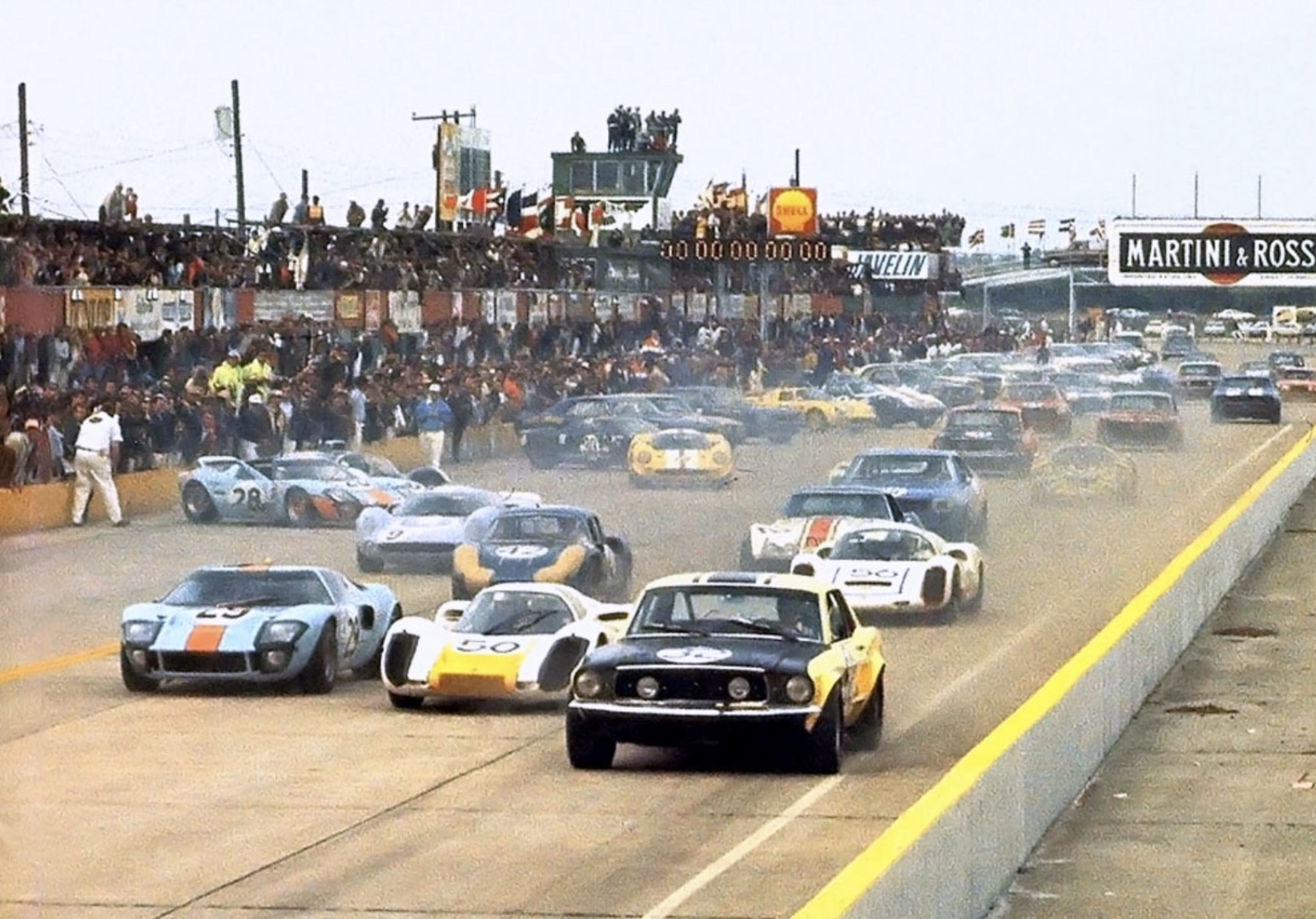 Marvin the Marvel’s Mustang leads the field at the start of the 1968 Sebring 12 Hour. Not quite. Jo Siffert’s Porsche 907 is to the left and off-screen, the winning car Jo shared with the very recently departed Hans Hermann.