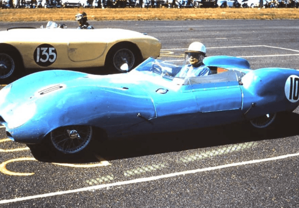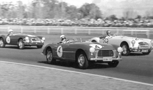 David McKay’s Aston Martin DB3S with trick Rice trailer behind, Fisherman’s Bend 1958.