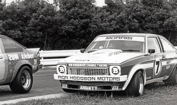 Here he is doing the Light Car Club of Australia a favour by cutting the grass on the inside of Dandy Road. He is running, or trying to, up the inside of the A9X Torana driven by Pete Geoghegan, Geoghegan won his last ATCC race that April 1978 day. Pete won from Morris and Allan Grice, also Torana A9X mounted.