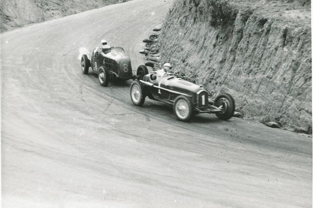 Lex Davison’s high born Alfa Romeo Tipo B being chased through Forrest’s Elbow by Doug Whiteford’s more utilitarian but very fast Ford V8 Spl ‘Black Bess’ at Mount Panorama during the Over 1500cc Handicap race, October 1950.