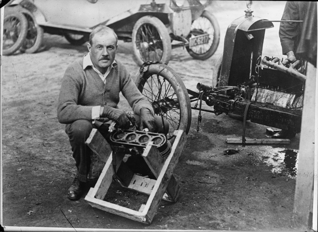 The main man, Andre Lombard, in the Brooklands paddock, tending to his Salmson during the October 22, 1921 meeting in which he won the Light Car Derby. He made his name competing in the engineering of the Billancourt-based marque.