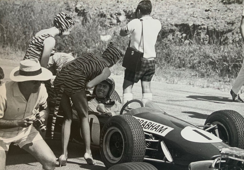 Esso babes, high heels and all, doing their promotional thing in the hot Queensland sun. It wasn’t too bad a day in the office. Jack was second behind Jim Clark’s Lotus 33 Climax FWMV 2-litre V8 in his Brabham BT23A Repco 640 2.5 V8, with Frank Gardner third in Alec Mildren’s Brabham BT16 Coventry Climax FPF 2.5. Brabhams occupied five of the first six placings, but not the one that mattered.