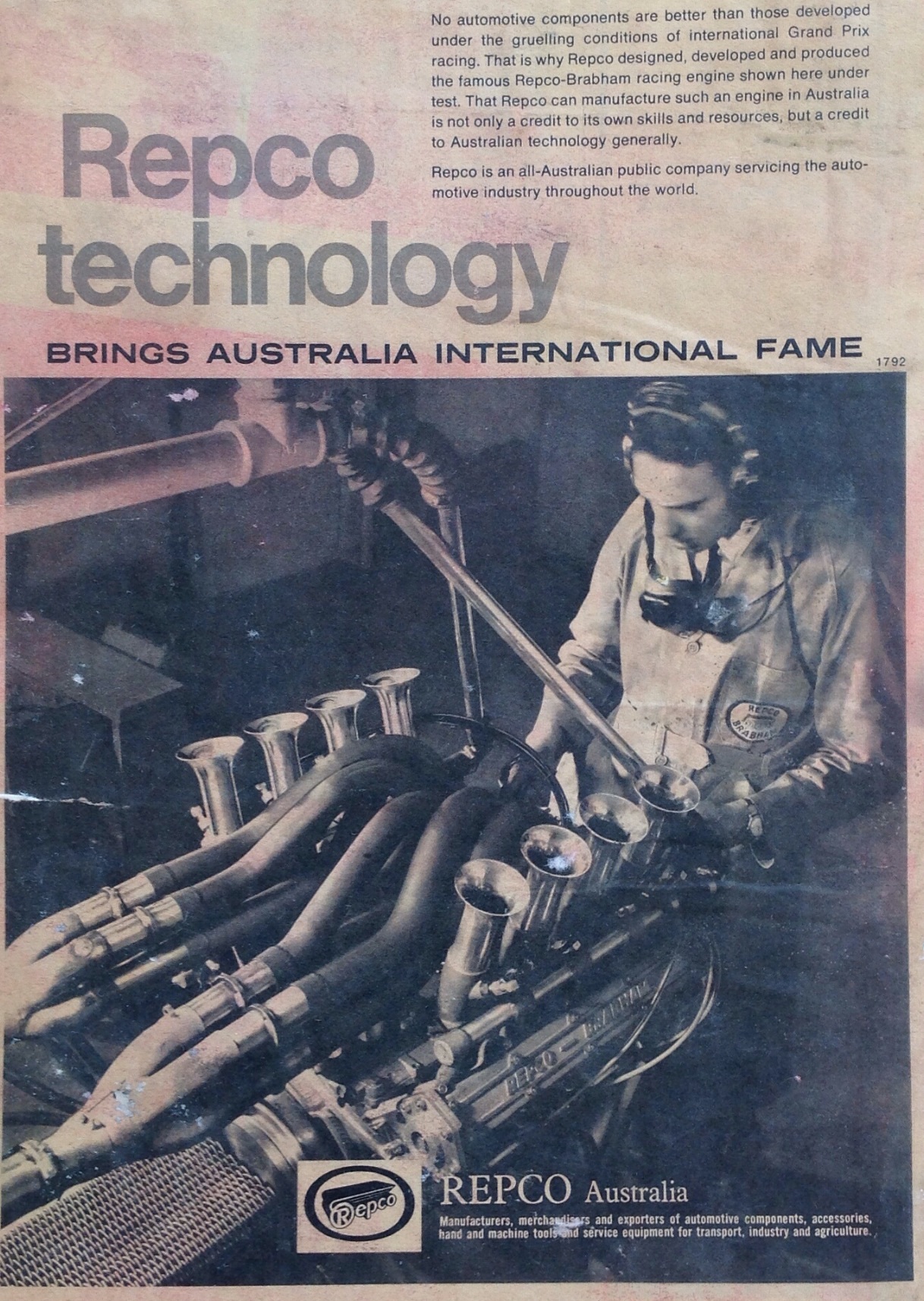 Repco made much of these wins: As we have said before, car racing is not our business, but central to our business is the technology required to design automotive parts and to produce them to the highest standards of precision and reliability. We believe it will long be a source of reassurance to our customers, our employees and our shareholders that in 1967/68 engines completely designed and manufactured by Repco Limited outperformed the world’s best, in race after race. 74