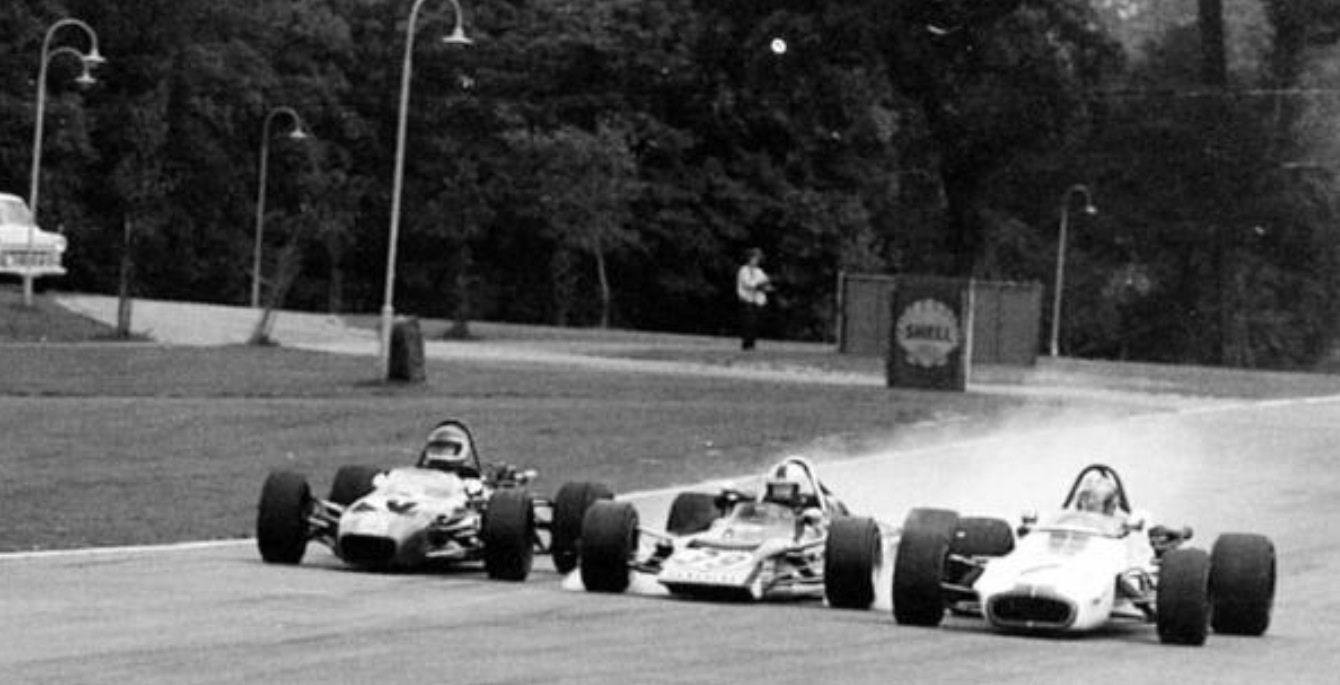 Moss carved through the field from the back of the grid, he was sixth by the time the cars reached the end of the straight and turned into College Corner.