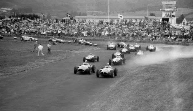 This amazing grid was due to ‘the barnstorming tour by the NZIGP’s livewire secretary Frank ‘Buzz’ Perkins, who had taken off the previous July, followed the circuits of Europe, and signed up everyone in sight, including the eventual world champion, Mike Hawthorn, whose grim tenacity won him the 1958 crown in the face of the greater brilliance of Moss’ wrote Sergent.