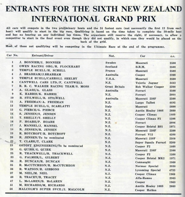 Pole position on the grid was Flockhart’s, followed by Brabham, McLaren, Bonnier, Schell, Shelby, Ross Jensen, Stillwell, Gibbons, Syd Jensen, Mansel, Clark, Hoare, Neil, Thackwell, Glass, Quirk, Harris, Gilbert, Freeman, Moss and Shelly.