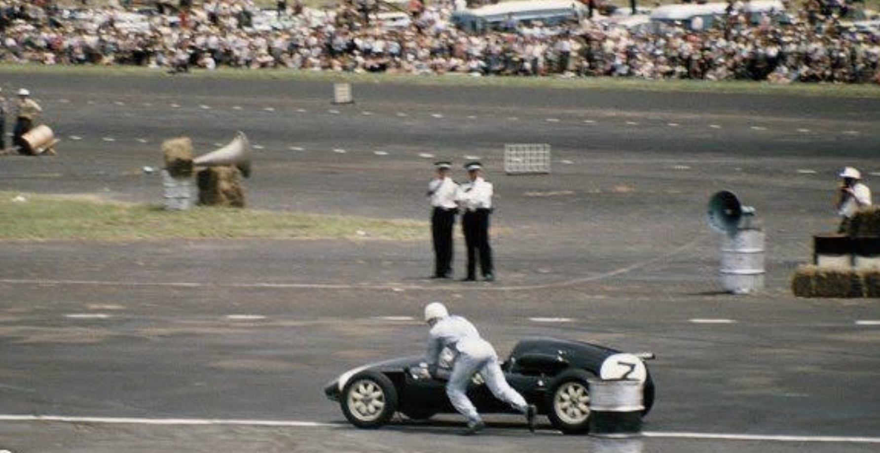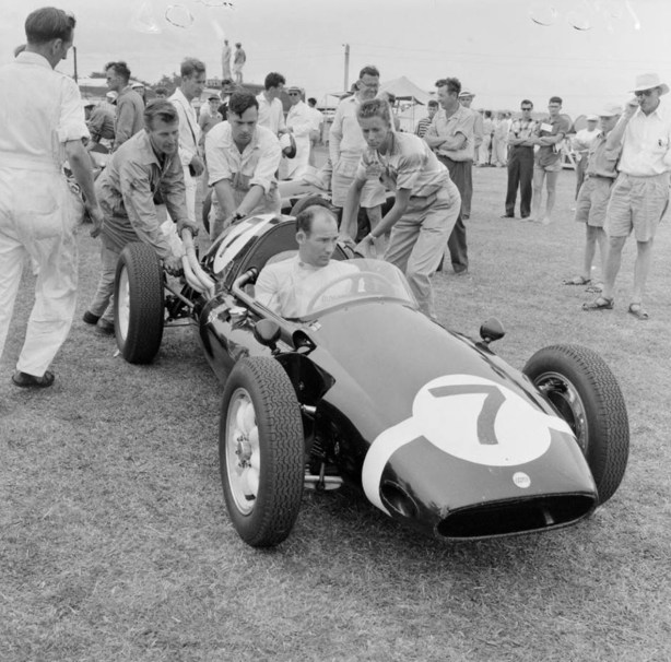 At the circuit, much to the crowd’s disappointment, Moss broke a halfshaft. Brabham had a spare Cooper and, without hesitation, offered the part to the Moss crew, who set to work to replace the part.