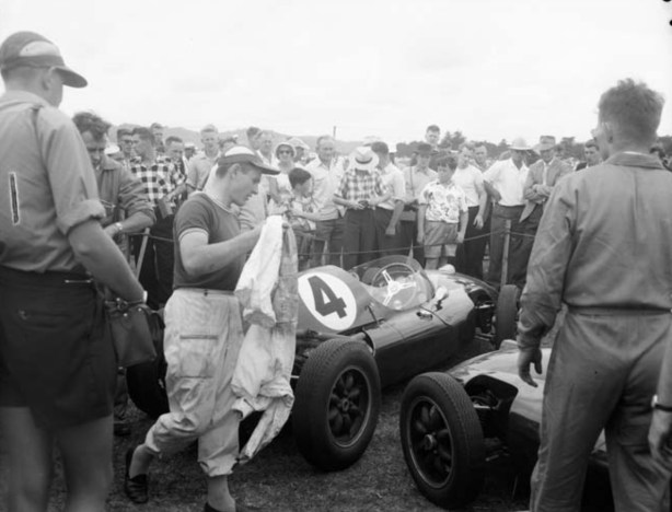 The fans check out the latest Cooper at the McLaren Garage in Remeura before the Ardmore meeting- Brabham’s T45 Climax.