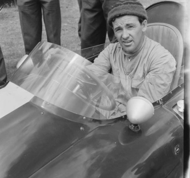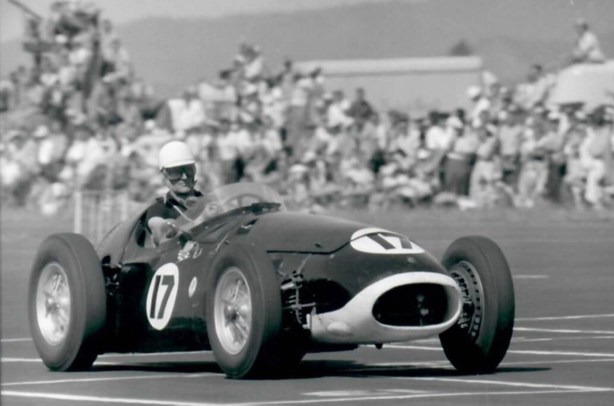Bib Stillwell smiling for the camera, although I doubt he would have listed his ex-Hunt Maserati 250F as amongst his favourite machines however much they were the customer 2.5 litre GP car of the era. More of a Cooper and Brabham kinda guy?