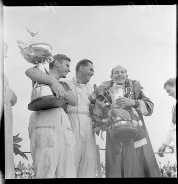 ‘Probably 80,000 people saw the race, a record for any type of sporting event in New Zealand. Moss’ time, 1h 48m 24.4s, an average of 82.8 mph., was over three miles faster than Brabham’s winning drive over exactly the same course the year before, and he put in a lap of 1m 24.8s (85 mph), also a race record, though well outside his remarkable 1.21.5 in practice.’