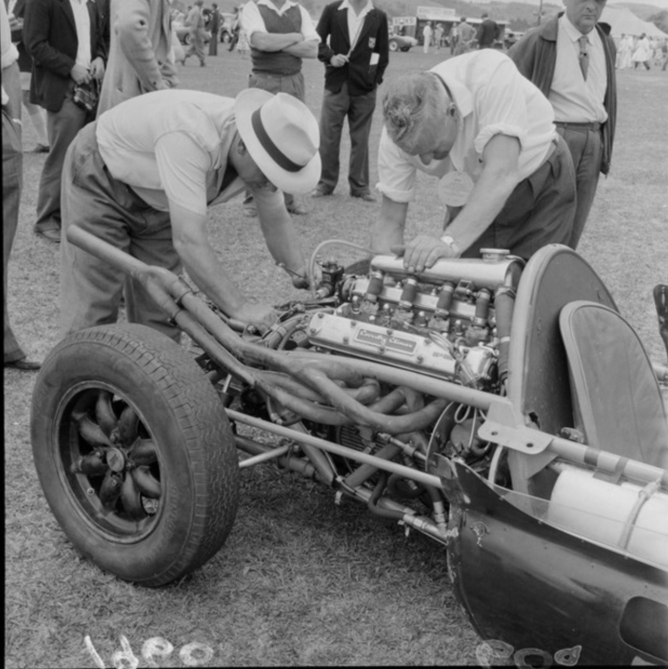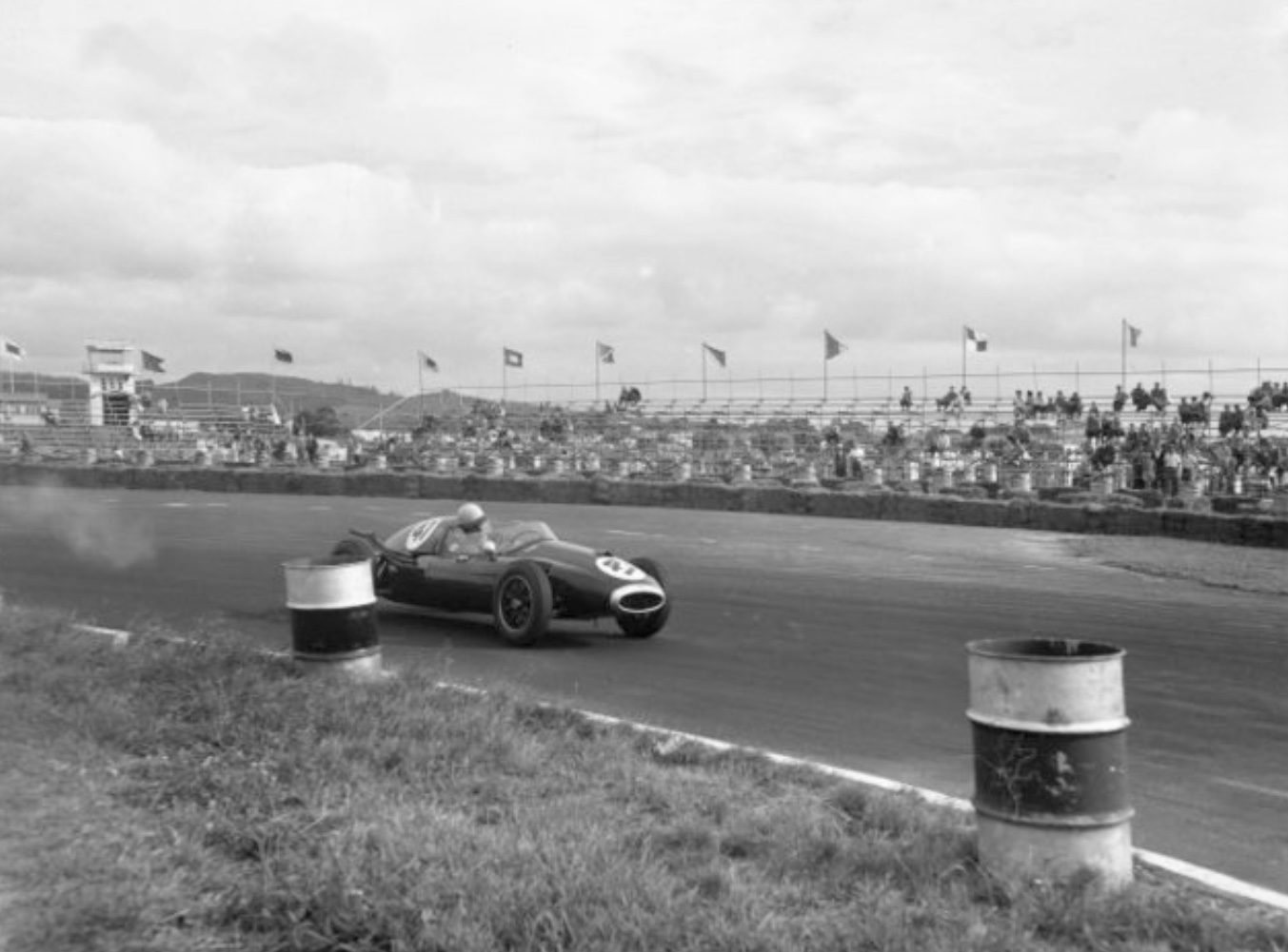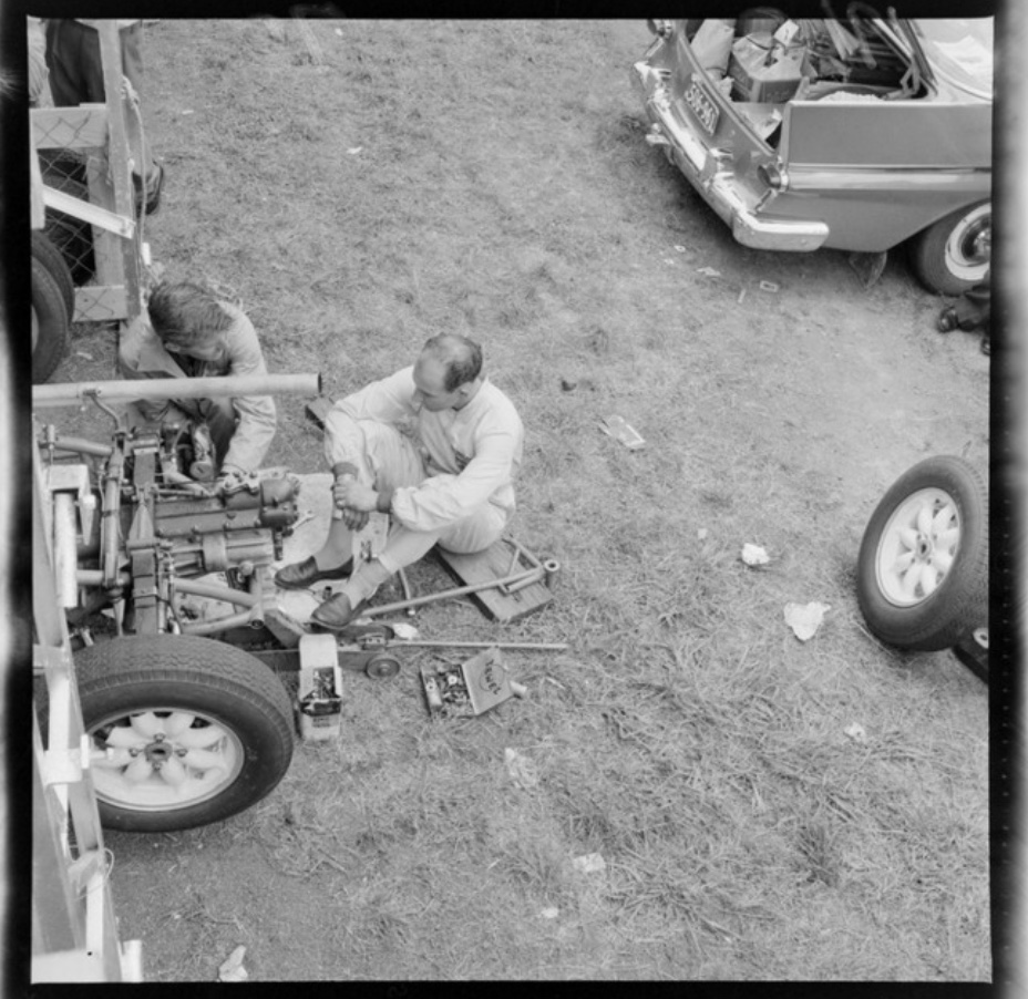 At the circuit, much to the crowd’s disappointment, Moss broke a halfshaft. Brabham had a spare Cooper and, without hesitation, offered the part to the Moss crew, who set to work to replace the part.