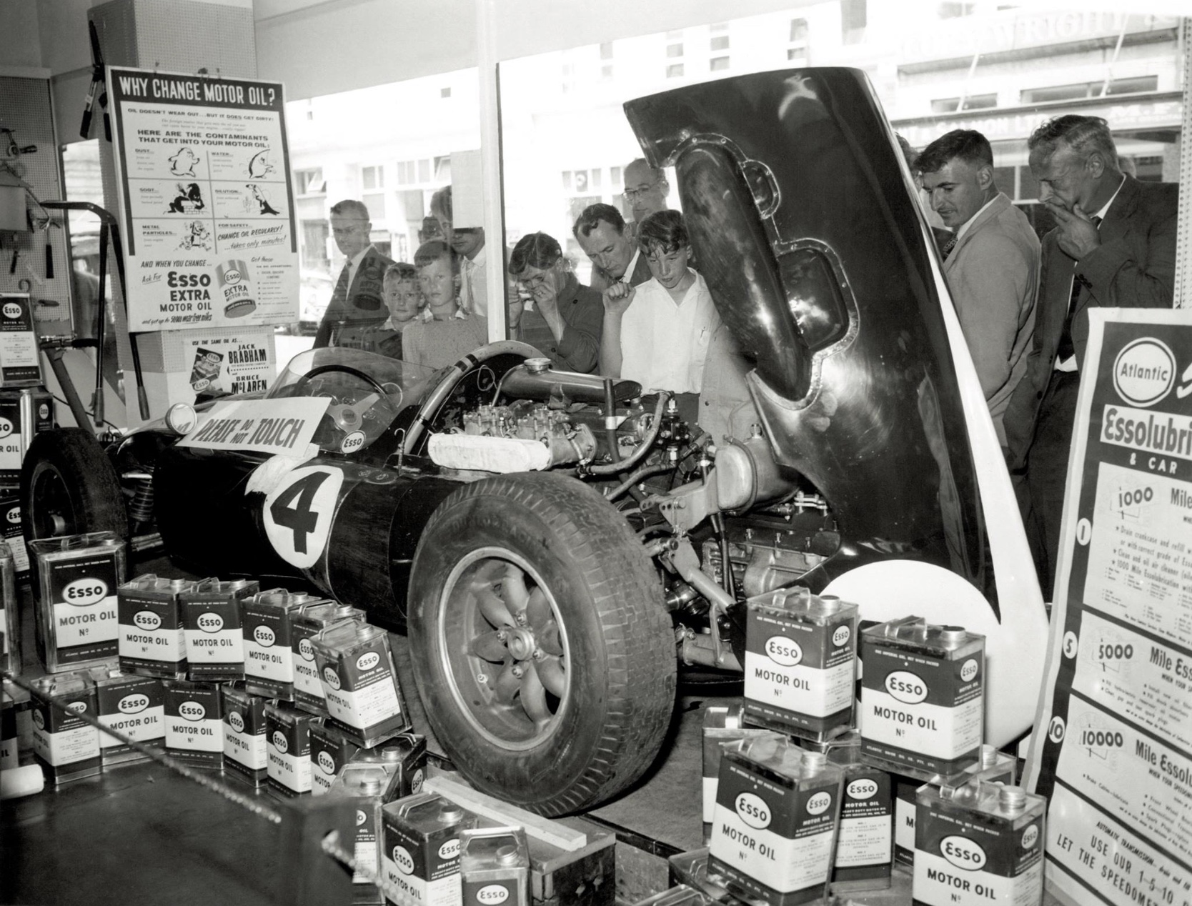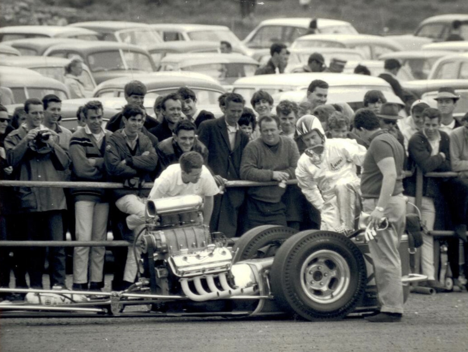 The fans check out the latest Cooper at the McLaren Garage in Remeura before the Ardmore meeting- Brabham’s T45 Climax.