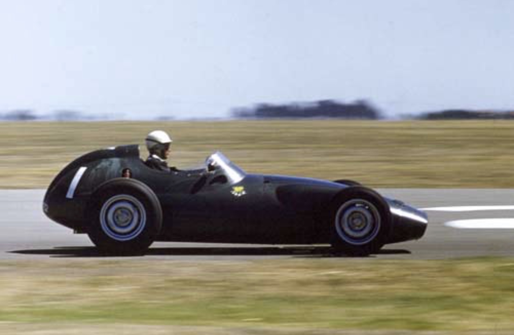 In the afternoon Moss did ‘1.21.5, a time which caught organisers napping by being right off the official time-to-speed conversion chart. This was 5 seconds better than Jensen’s record. Moss’ driving in practice could only be described as fantastic, and no-one who was there will ever forget the sight of the Cooper coming out of the left-hander into Pit Straight, travelling at well over 100 mph and literally bucking with the acceleration, while Moss coolly kept the car in line.’