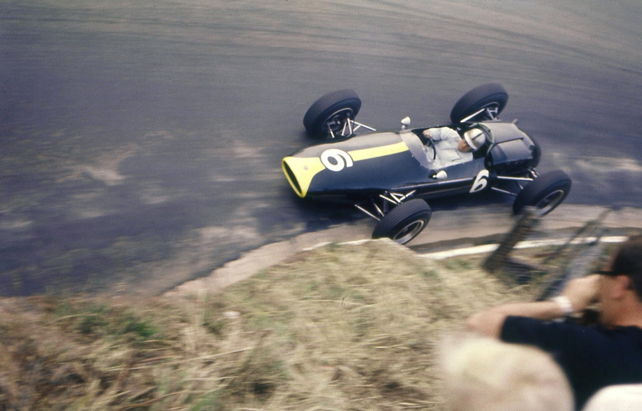 Along the back straight, having by then overtaken all but Schell, Bonnier and Brabham, Moss jumped Brabham, but was in turn overtaken by Jack going into the Cloverleaf.
