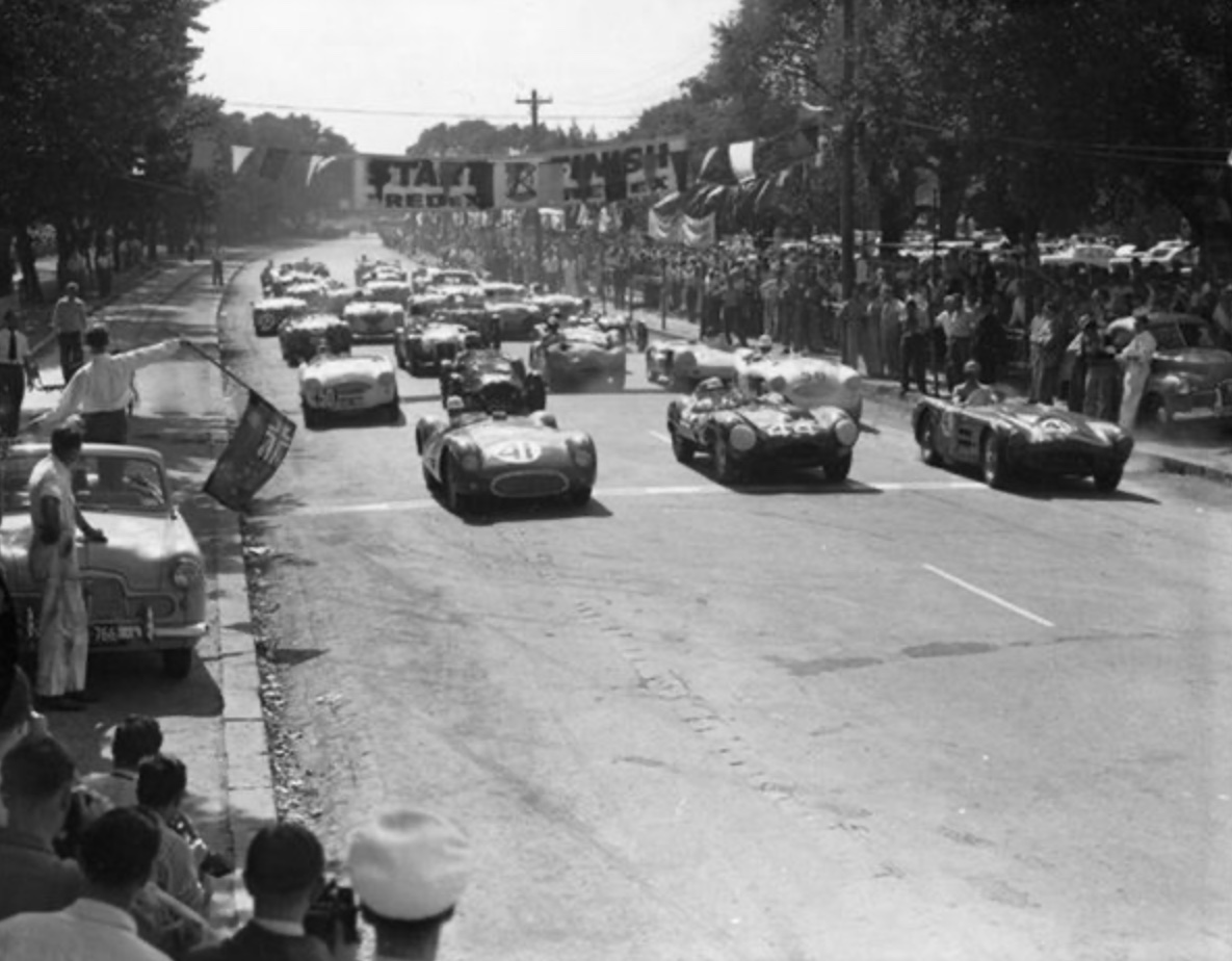 From the left it’s Jo Bonnier #2529, Carroll Shelby #2534, Harry Schell #2533 and Bib Stillwell #2516. Three other 250Fs were entered that weekend: Ross Jensen #2509/2504, Gavin Quirk #2504/2509, and Johnny Mansel #2508/2513.
