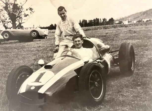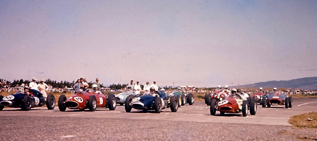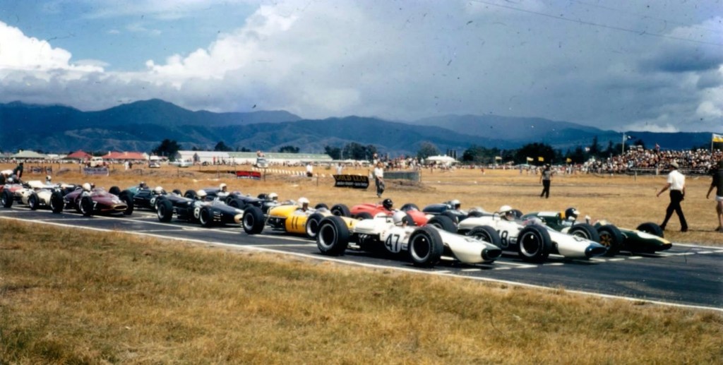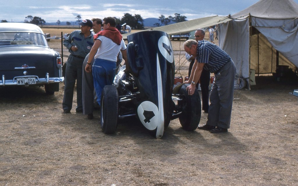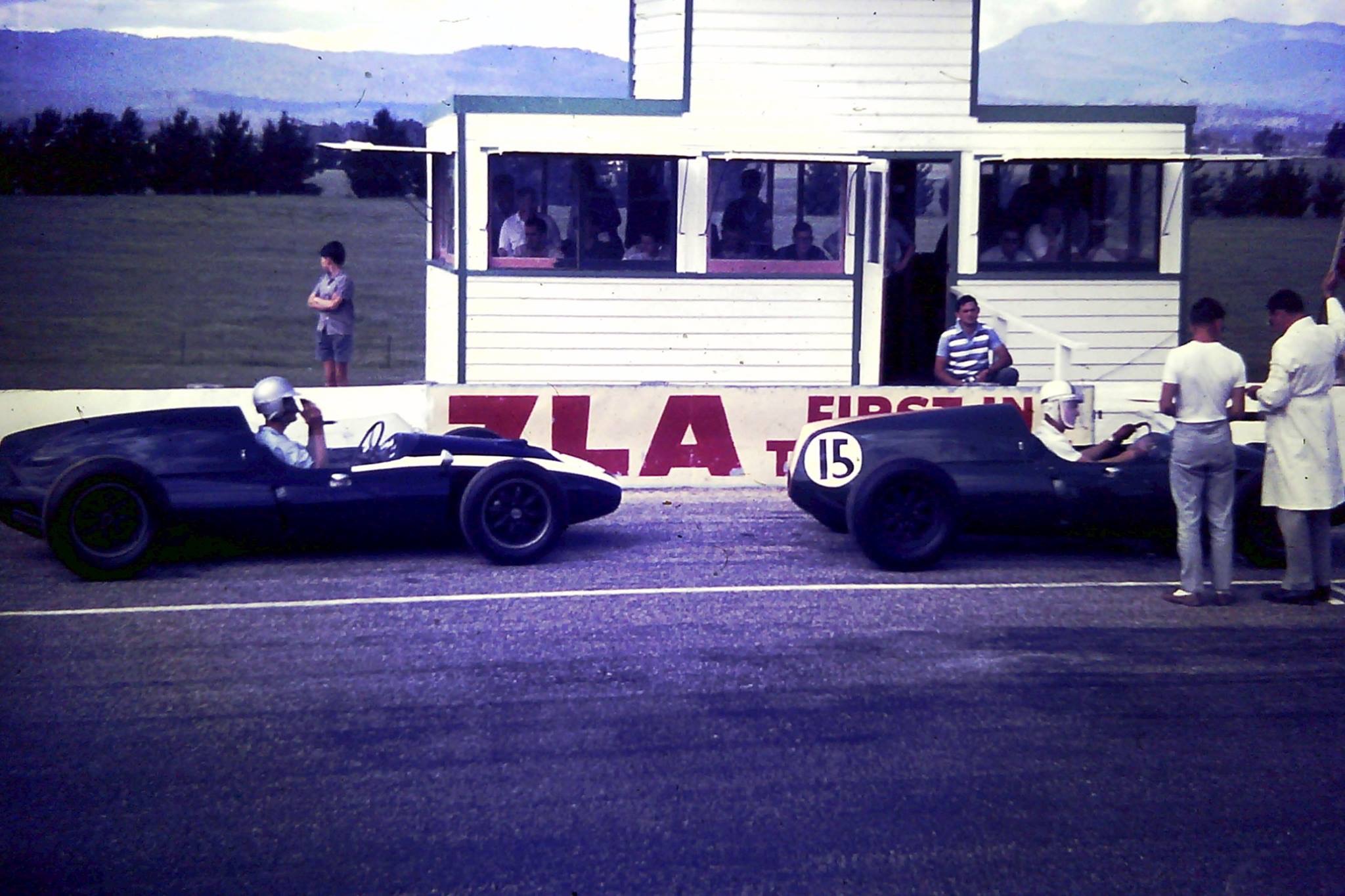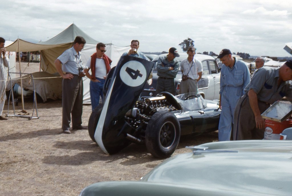 Here he is on the Teretonga International grid on pole at right with Denny Hulme’s Cooper T51 Climax, Pat Hoare, Ferrari 256 and Tony Shelly’s Cooper T45 Climax – with ? Lycoming Special looming large at the far right.