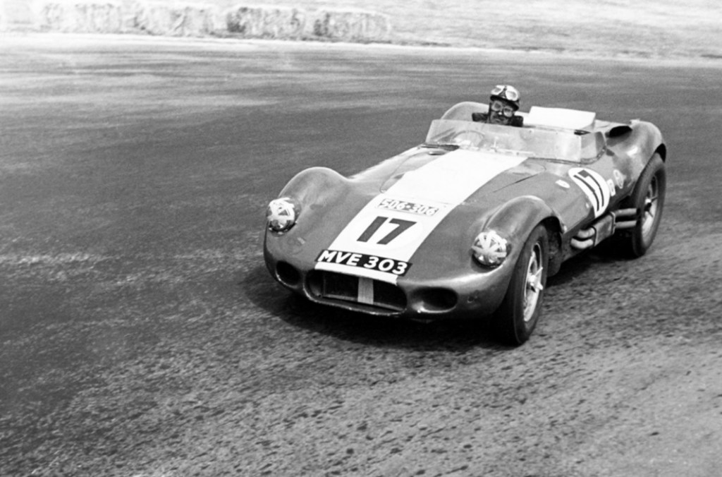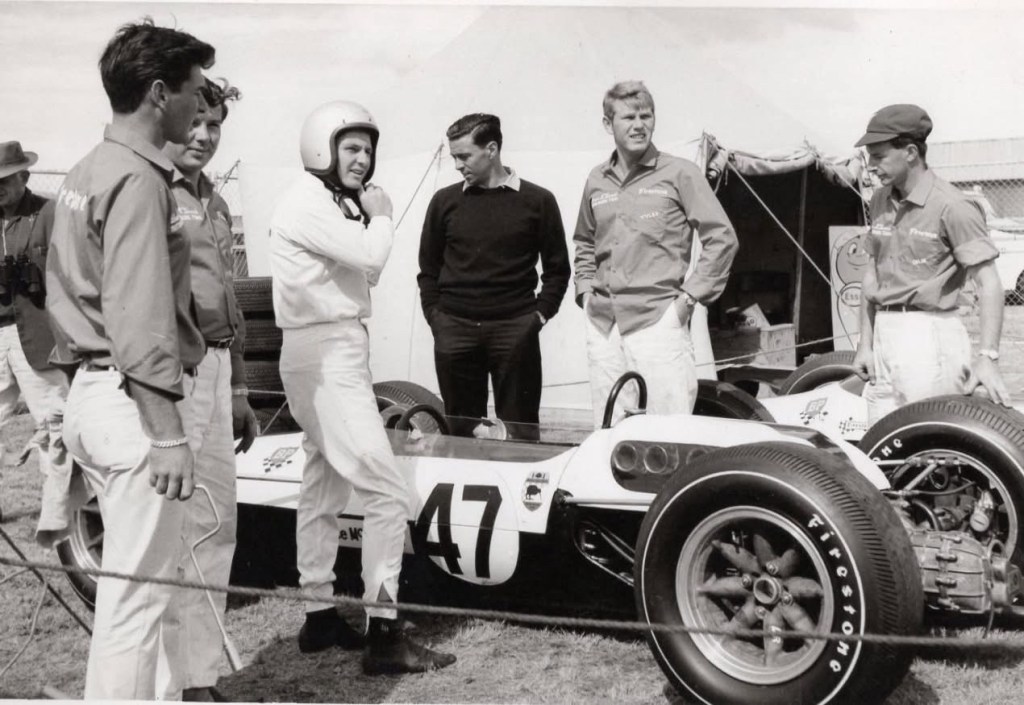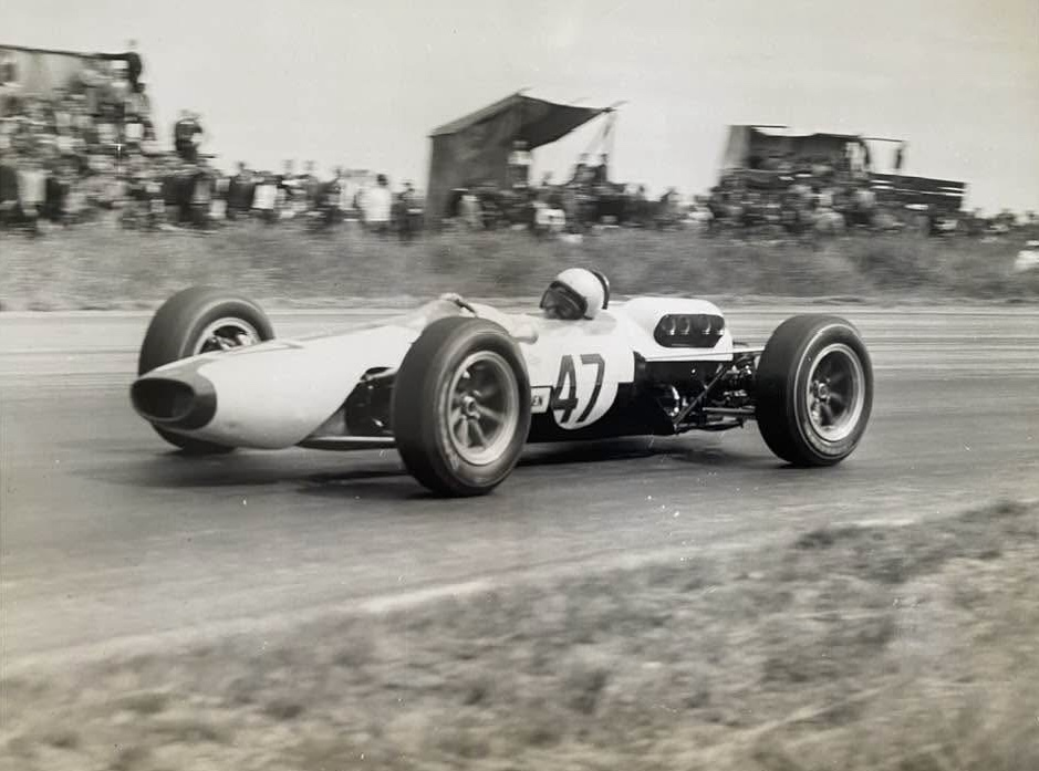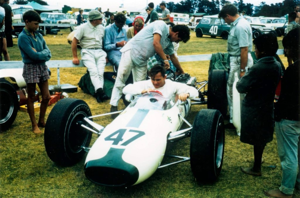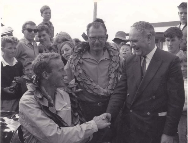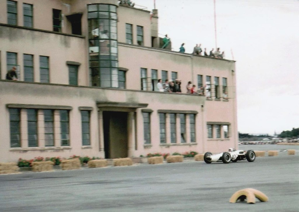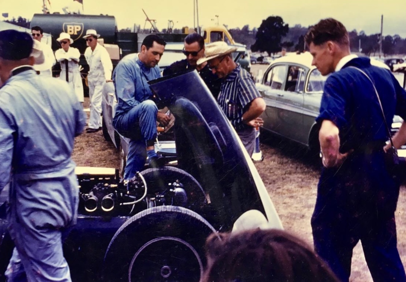 Here he is on the Teretonga International grid on pole at right with Denny Hulme’s Cooper T51 Climax, Pat Hoare, Ferrari 256 and Tony Shelly’s Cooper T45 Climax – with ? Lycoming Special looming large at the far right.