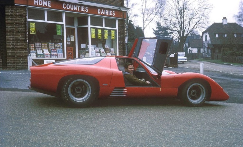 The famous shot of Bruce McLaren picking up the bread and milk from the East Horsley Home Counties Dairy in winter 1969, McLaren M6GT Chev. A good story about the car here:https://www.topgear.com/car-news/big-reads/driving-bruce-mclarens-m6gt
