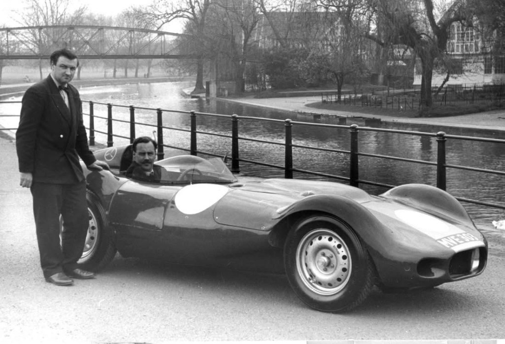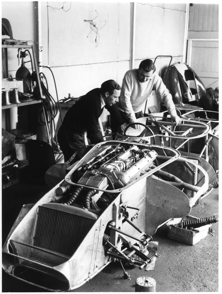 Archie Scott-Brown and Brian Lister ponder the construction of the prototype Lister-Jaguar chassis BHL2, registered MVE303…and 506 306 in late 1956 or early 1957 at the Lister family’s Cambridge workshop.