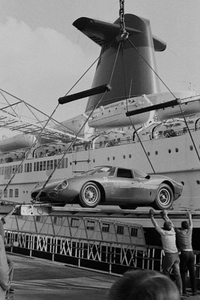 N.A.R.T.’s Ferrari 250LM #5893 – the 1965 Le Mans winner in the hands of Johen Rindt and Masten Gregory – dangles above the wharf at Le Havre after its trip from New York on the liner, France, September 18, 1968, destination, La Sarthe.