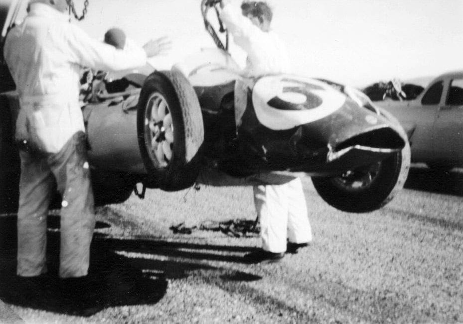 ‘Bonnier had a successful 1961 tour with Yeoman Credit. He won convincingly at Levin (beating Jim Clark) and Teretonga despite having an old car. After winning the main Teretonga race, he went off in the Flying Farewell (an all-in race at the end of the race weekend, a ‘Butcher’s Picnic’ in Australia), damaging the car so badly that it wasn’t considered worthwhile taking it back to Europe, so it was stripped of its parts and left in Invercargill. Nobody knows what happened to it. Here it is being recovered from the lupins (above) at the end of the main straight.’