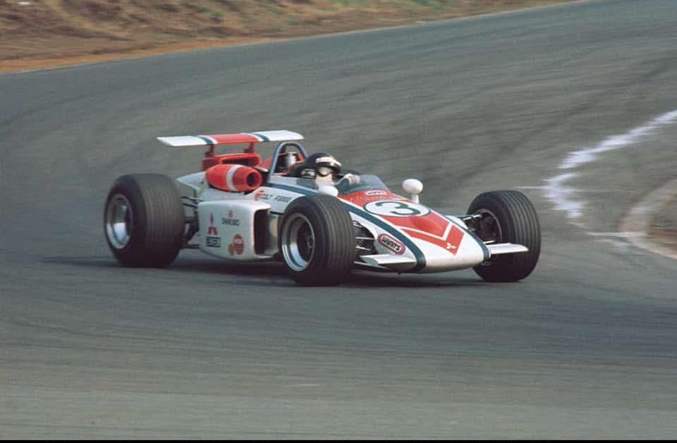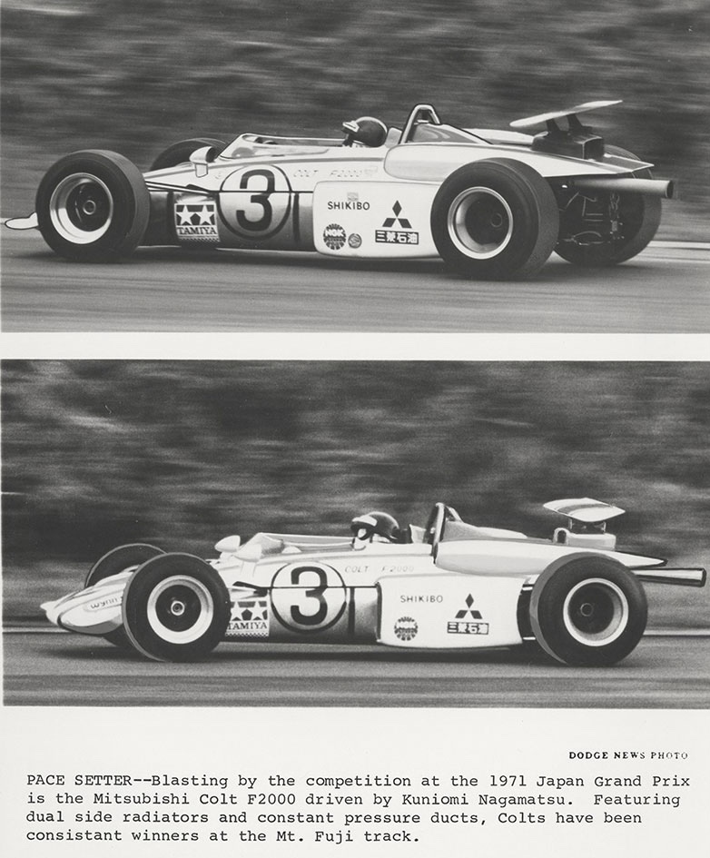 Kuniomi Nagamatsu on the way to victory in the May 3, 1971 Japan Auto Federation Japanese Grand Prix at Fuji International Speedway aboard his Mitsubishi Colt F2D/F2000 R39B 2-litre.