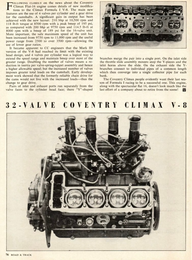 Originally conceived as a 1,500-c.c. engine for Formula 2 racing, which was introduced at the beginning of 1957, the FPF engine was contrived from pieces from the ill-fated 2,500-c.c. V8 Godiva engine built by the same firm. That engine was a complete failure for various reasons, and realising the need for an engine for Formula 2 racing Coventry-Climax used the cylinder head design from the Godiva and adapted it to a four-cylinder engine of 81.2 by 71.1 mm. bore and stroke. Being a commercial firm interested solely in selling engines, and having no direct connection with motor racing the FPF had to be designed and built to a definite price limit, unlike a pure Grand Prix engine, and in consequence it was sold as a 1,500-c.c. unit with a reasonable power output, but nothing phenomenal, nor was there anything particularly outstanding about the layout, having gear-driven twin-overhead camshafts and single sparking plugs to each cylinder, and using two double-choke carburetters.