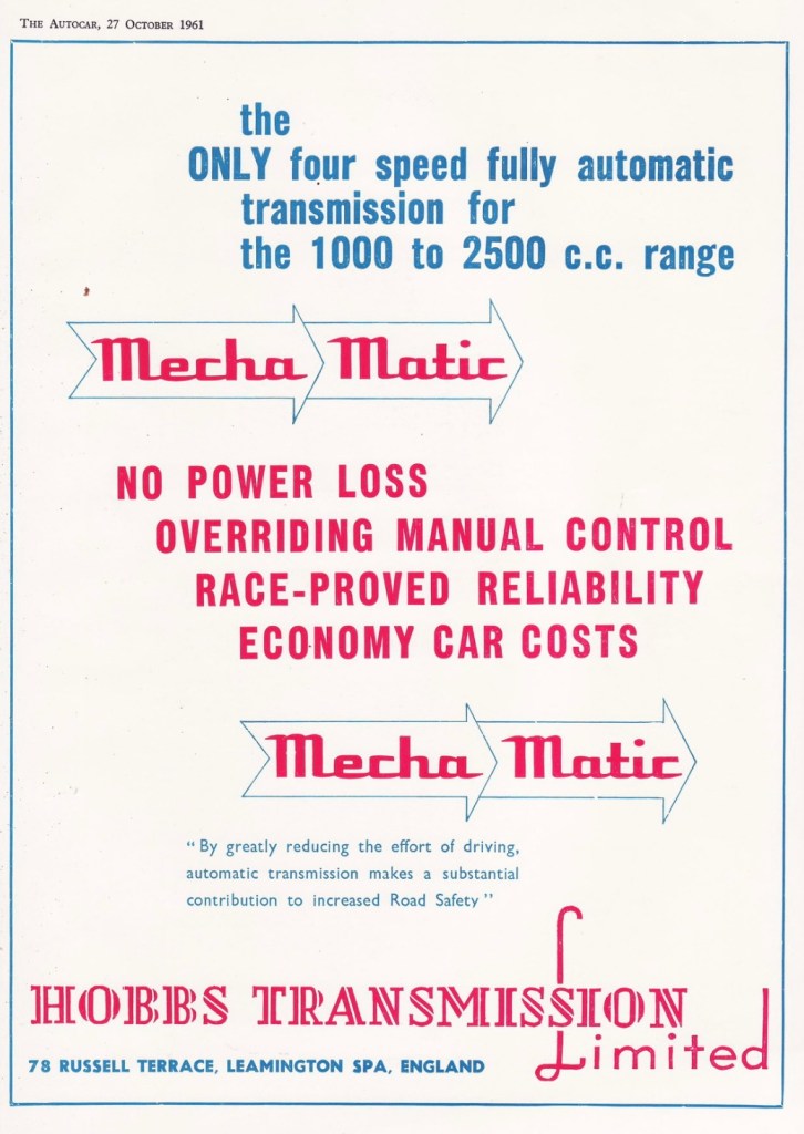 Rupert Lloyd Thomas wrote on The Nostalgia Forum, ‘Let us try and put the achievements of Howard Hobbs in context. He built the 1015 automatic transmission and fitted it to a Lotus Elite for the 1961 season.