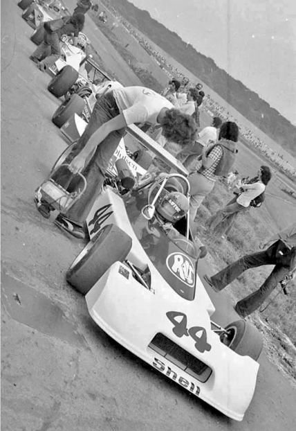 When race day dawned very wet, the probable front-runners were rated as Stewart and Leffler, who had sets of Firestone wets of the type used by Brit Steve Thompson, who had run away and hid in his Chevron B24 Chev in the similarly soggy, steamy 1973 Warwick Farm 100 Tasman round.