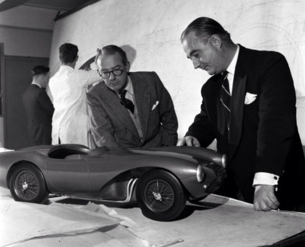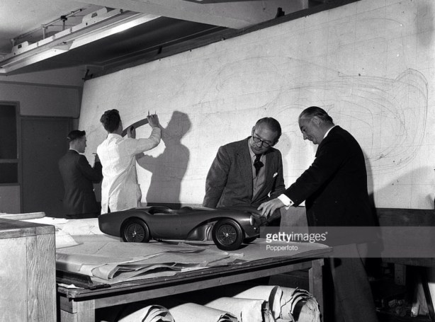 Frank Feeley, Designer (right) and Aston Martin’s owner David Brown with a clay model of Feeley’s Aston Martin DB3S in the Feltham design studio, 1954…
