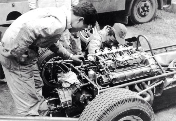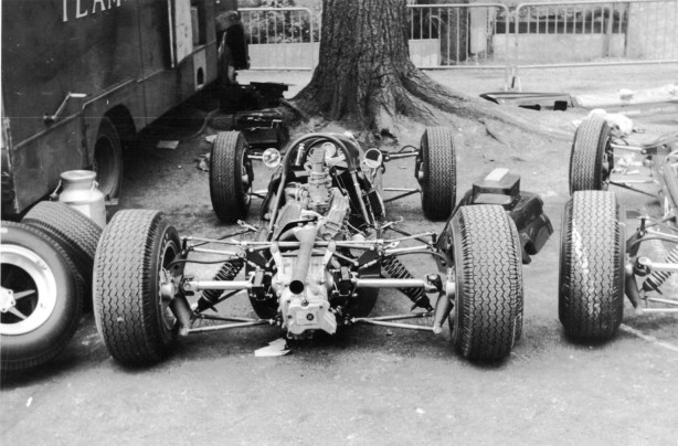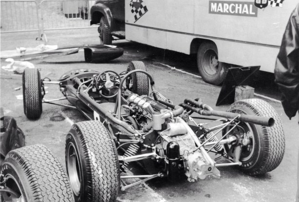Hewland ratio change in Jacks BT16 in the Pau paddock- there were lots of them as Brabham tried to match ratios to the peaky 1965 variant of Honda’s S800 engine. Brabham raced much of the ’65 F2 season in SCA powered cars as Honda development continued (Gordon)