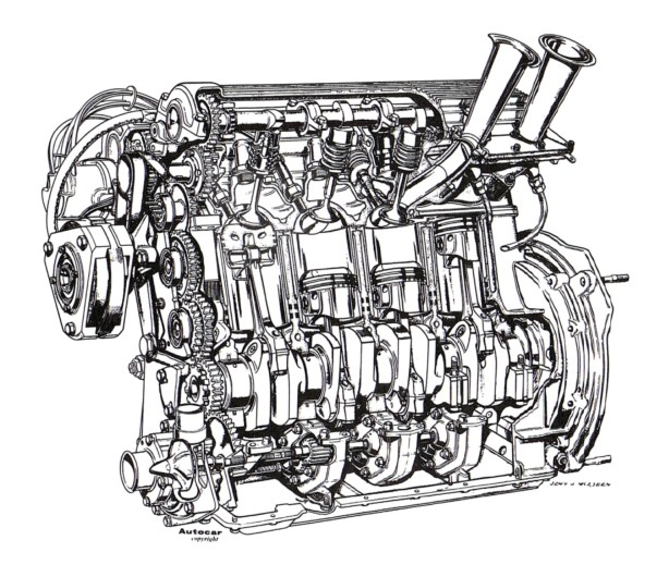 The engine was notable for its bowl in piston combustion chamber or ‘Heron Head’ design. ‘My simple argument was that at the compression ratios we could use, and the valve sizes needed to ensure good breathing, that a bathtub type of chamber ended up masking the valves. It was an awfully long way around their periphery. I argued with myself, that if I put the combustion chamber in the piston, then for most of the time the valves would be out of the way, and that they wouldn’t impede the flow’ Duckworth said.