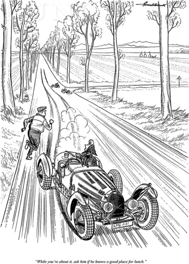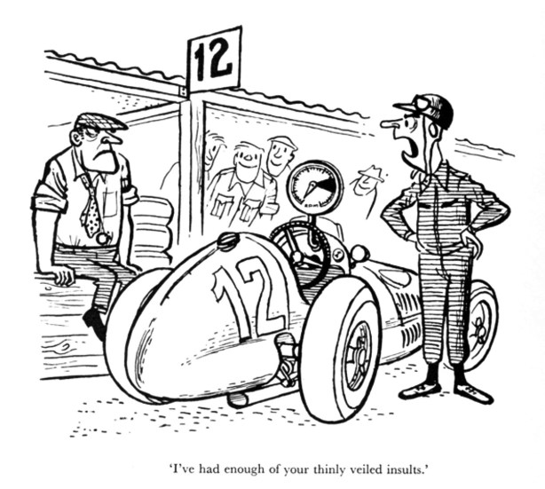 By 1949 he was the Art Editor of Punch. His passion and knowledge of cars and motor racing shines through in the technical accuracy of his work as do his characters-Major Upsett with his outmoded ‘tache and clapped out Austin 8. Not to forget the ‘Old Biddy’ haranguing her long-suffering husband, the Rolls driver and Latin racing drivers. Nothing missed his eagle eye.