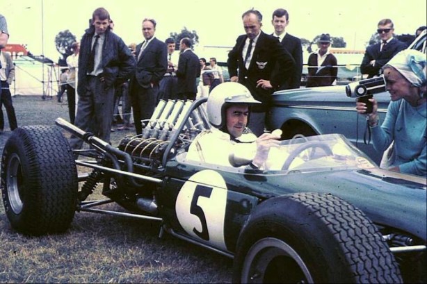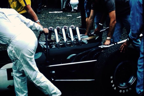Tailpiece: The Repco hierachy at Sandown upon the RB620’s Australian debut, 27 February 1966. Phil Irving leaning over BT19 and trying to grab another fag from Frank Hallam’s packet. Norman Wilson with head forward leaning on the rear Goodyear, Kevin Davies and Nigel Tait in the white dust coat…and Jack wishing they would bugger ‘orf so he could test the thing. Nigel Tait recalls that the car probably had 2.5 engine #E2, had no starter motor and he the job of push-starting the beastie…