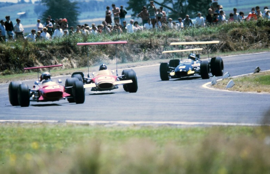 Winged F2 cut and thrust 1969 style; ‘BARC 200’, Thruxton 7 April 1969. Motor cycle champ Bill Ivy Brabham BT23C Ford DNF leads another car, then Tino Brambilla’s Ferrari Dino 166 6th and Servoz Matra MS7 Ford 5th (unattributed)