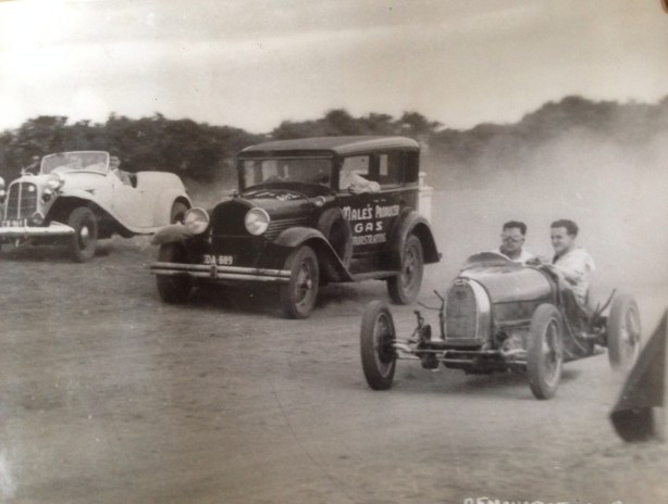 Barney Dentry and unknown passenger aboard the Dentry modified Riley 9 Brooklands, giving the Bill Thompson Bugatti T37A a wide berth at Heaven Corner, Phillip Island 100, January 1, 1934. The Bugatti is about to spin, possibly distracted by the Riley’s change in trajectory, DNF valve, Barney was third (Dentry Family)
