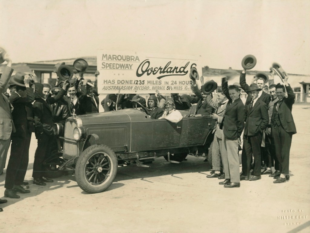 Don Harkness and Phil Harbutt covered 1236 miles and 122 yards, averaging 51 1/2 miles an hour aboard a ‘standard four seater Overland 6 from which the mudguards and rear seats were removed’ at the Olympia Speedway, Maroubra, Sydney.