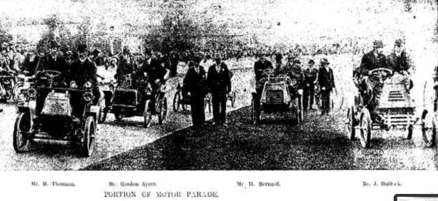 ‘The story of the evolution of the motor car was admirably told on Saturday in the exhibition of ancients and modern methods of locomotion…the early form of the bicycle was illustrated by old wooden velocipedes…40 years old…ridden in the old fashioned costume of top hats and black suits with flying coat-tails…Alongside of these were motorcycles ridden by Messrs TP O’Grady, A Allison, W Baulderstone, W Courtney, R Davis, HM Aunger, RW Lewis, FR Burden, EA Gowan, D Bruce and EF Wilksch were shown.’